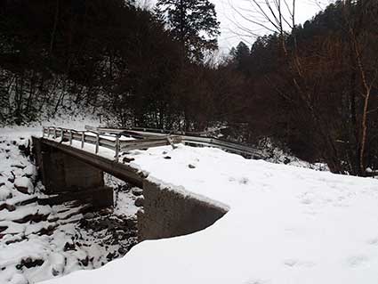 | 福栃沢橋はガードレールがひしゃげていた。上の写真は渡ってからとったものだが、写真の左が上流で、 左側から大きな岩が混ざった土石流が橋を乗り越えていったのだろうと推測される。 下山した時はこのガードレールは直していた。 この場所は4回目なのでなじみの場所だ。ゆっくり休んだ。雨は未だ降っていた。 |