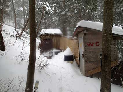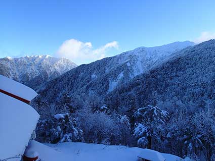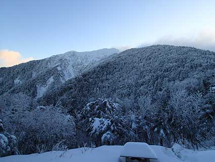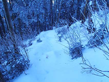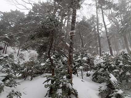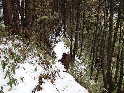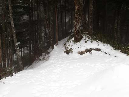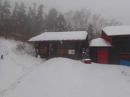 | 越百小屋へ向かって下りていく登山道。 13時頃越百小屋に到着した。入り口は除雪する必要がなかった。 みぞれが雪に変わっていた。 |