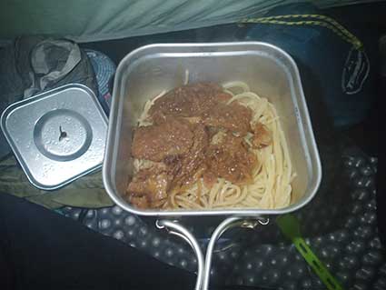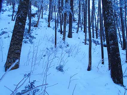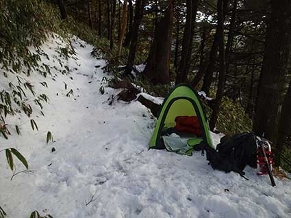 | 15:30頃 1900メートルくらいのところに幕営地を決めた。立木の根元に適当なベンチがあった。 アイゼンをつけたりするのに便利だ。 雨はこの頃までに上がっていた。 この日は余り寒くはなく、夜になってもダウンジャケットを着る必要が無かった。 因みに、この日のコスチュームは、 上は長袖のゼロポイント風シャツ、長袖マイクロフリース、フリースのベスト、冬用のゴアテックスアウター 下はパンツ、膝丈のゼロポイント風股引、長ズボン、冬用アウターズボン だ。 夕食には今回初めて購入したアマノフーズの「チキンカツカレー」スパゲッティにした。 1食600円もするが、なかなかの優れものだった。 スパゲッティは100グラム。3分茹での物だ。 石川PAで買ったミカンを3個持ってきたので1個食べた。 夜は良く晴れ、月明かりが明るかった。 12月23日天皇誕生日 朝4:30に起きた。 未だ何も降っていなかったが、曇っていた。 朝食は餅を3きれ焼いて醤油をつけて食べた。一切れ50グラムのものだ。味噌汁も食べた。 まだ暗かったが6:30に出発した。 アイゼンをつけて歩き出した。 |