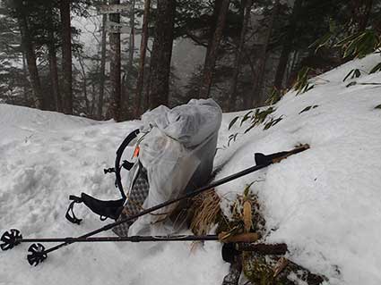 途中で雨が勢いよく降り出したので、ザックにカッパをかぶせた。 アイゼンをわかんに換えた。 上の写真は「上の水場」のあるところだ。 去年よりも雪が少ないのがわかる。 |