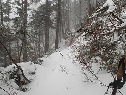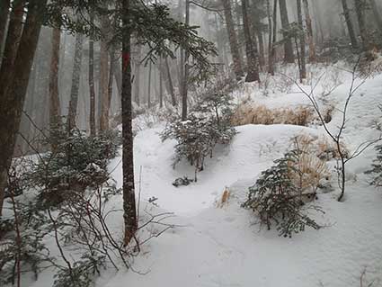 | 上の水場は2150メートルあたりにあり、これから先は傾斜が急になる。 昨年は夏道を見失い、雪の斜面を適当に登っていったので、ラッセルが大変だった。 今回は雪が昨年よりも少なかったので、夏道を見失わずに登って行けた。 途中で雨がみぞれに変わった。 |