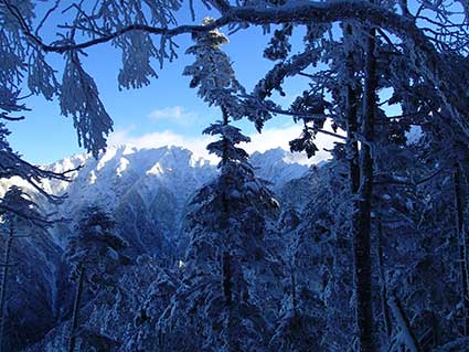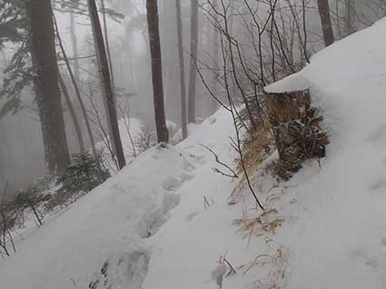 | 登山道のはじめの部分が崩落していて、山の斜面に取り付いて、トラバースしていくように道がつけられていた。 雪は少なかった。アイゼンもわかんもつけずに進んで行った。 駐車場の標高は約1000メートルで越百山が2600メートルぐらいであり、標高差は1600メートルだ。 この日の内に標高差で半分以上登りたかったので1900メートルを目標にしていた。 上右の写真は下のコルと上のコルの間あたりだろう。 |