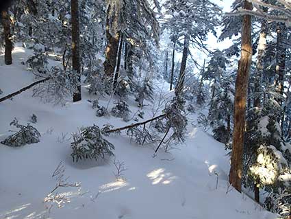 | 下りてきて振り返り山の斜面を撮った。 ルートは右端のリッジに絡むように上っていく。 |