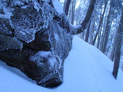 | トラバース道の終わりの部分にある大きな岩と J字型に生えた特徴的な木 |