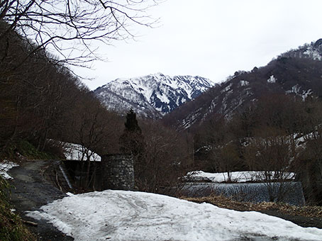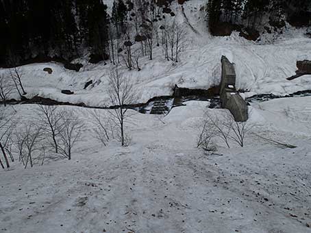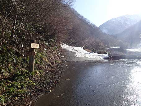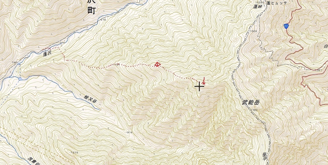 檜又谷を越えたら、蓬沢を渡った方が良いのか、と思っていたが、武能岳西尾根の末端は、雪が少なく藪漕ぎが大変そうだったので、もう少し上流へ行くことにした。