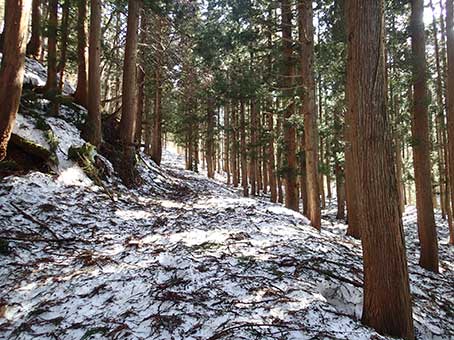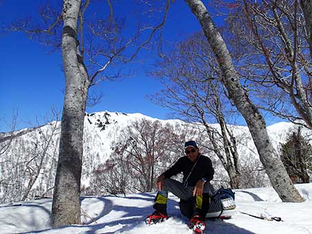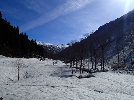 蓬沢に沿って、しばらく蓬峠への道をたどる。積雪がしっかりあったが、雪は良く締まっていて歩きやすかった。