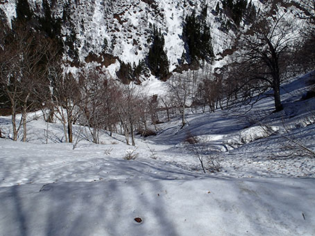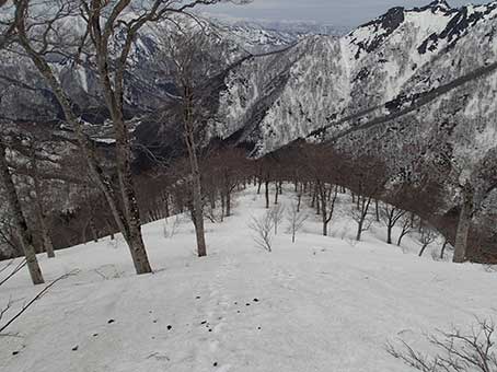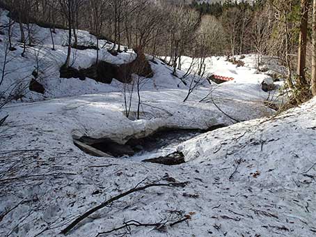 上流へ少し歩くと、沢は問題無くわたれる様になった。 この写真は蓬峠方面を見たところだが、 前方右側の斜面では雪が下から上までつながっており、 一番上に雪庇がなさそうだった。 標高780メートルくらい |