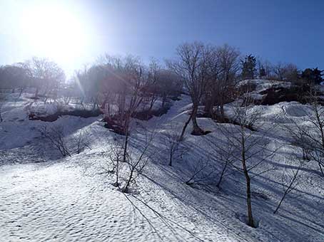 | この写真の左下から右上に向かって登れそうな斜面があった。 | 登ろうと思った斜面の真下から見上げたところ。 |