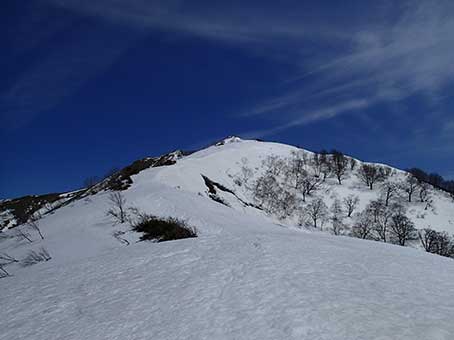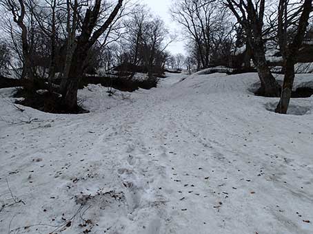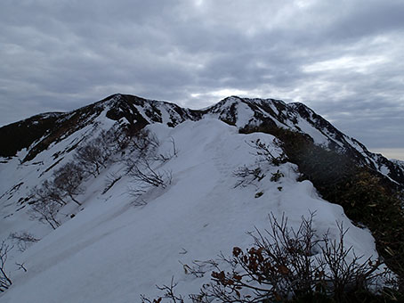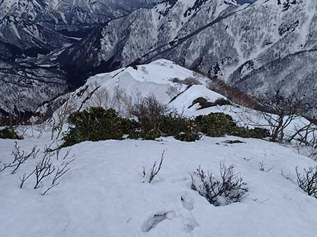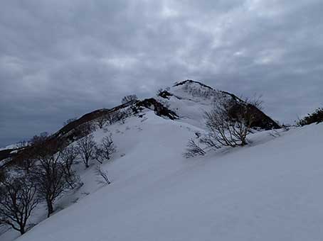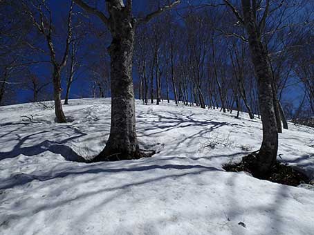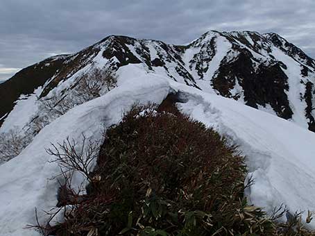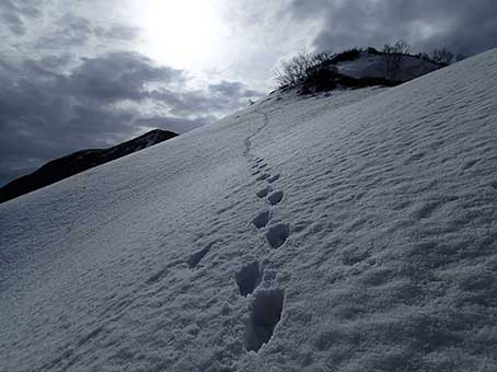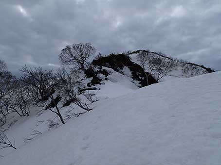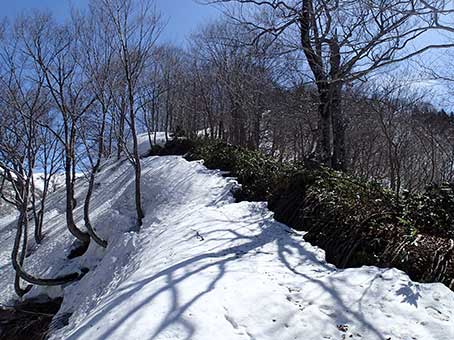 | 薄曇りの空、風はなかった。 | 雪が少なく灌木が露出しているところは登りにくかった。 |