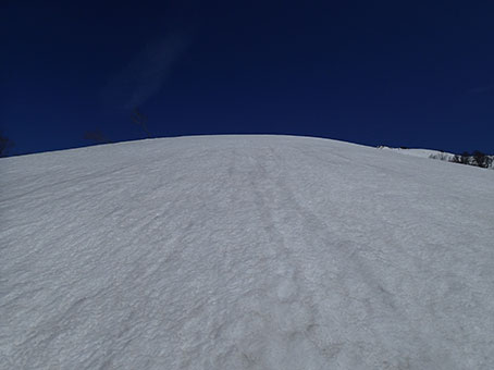 1630メートルで前方がナイフリッジになるが、雪が左右に割れ、前後にも不連続になってしまった。