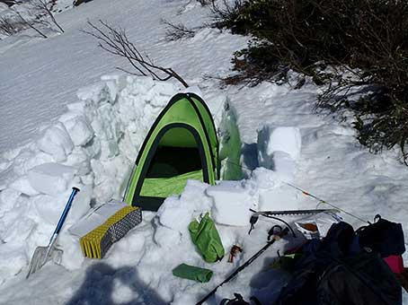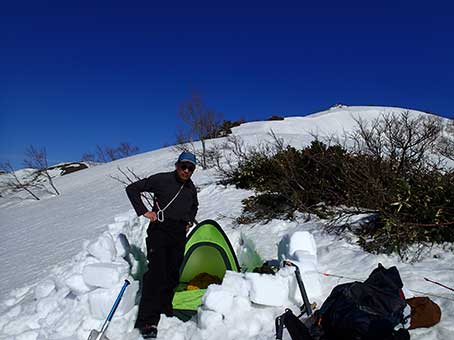 1430メートル地点で幕営する事にした。 雪洞を掘りたいとも思っていたが、写真の右側は雪庇であり 亀裂も入っていたので、左側で整地してテントを張ることにした。 今回は柄のついたスコップとスノーソーももっていったので 雪のブロックの切り出しに有効だった。 腰痛と股の攣れで大変だった。 |