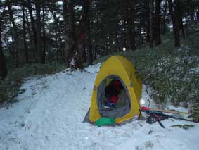 まもなく横手駒ヶ岳神社からの登山道と合流する。横手からの道は人通りが少なそうだ。この日は5合目まで行くのも大変なので、適当なところで幕営しようと思っていたが、雪が少ないと飲み水を作ることができないので、ある程度の雪があって、平坦な場所を探して登っていった。15:40ころにもう薄暗くなってきたので、道ばたにテントを張ってしまうことにした。