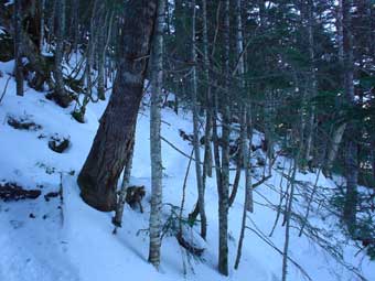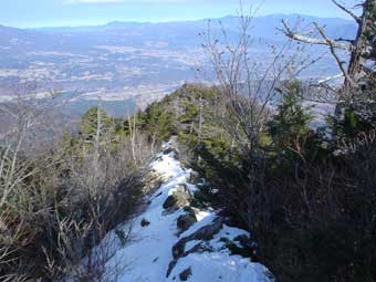 27日11:30 竹宇駒ヶ岳神社近くの駐車場に到着。雪は全くなかった。トイレは冬も使えるようだ。駐車していた車はざっと15台位だった。11:50出発。神社で登山の安全を祈念して吊り橋を渡って登山道を登り始めた。樹林帯の間の登山道をジグザクに登っていく。30分ほど登ると左方向へトラバースするようになりそこからほぼ稜線上をたどるようになる。深い枯葉の堆積を踏んでいく。1500メートルくらいのところで、今は崩壊のために使われなくなった粥餅石の水場への登山道と別れ、また稜線上をたどっていく。