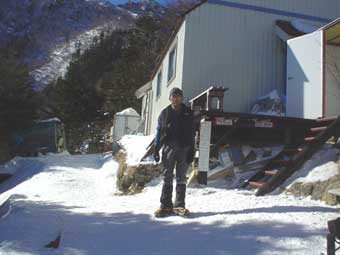 黒戸山をトラバースして五丈小屋に到着。91年の写真と見比べると雪の少なさが歴然としている。天気は上々で八合目九合目が良く見えた。大日小屋は形を留めていて宿泊可能だが、屏風小屋は土台が残っているだけだ。