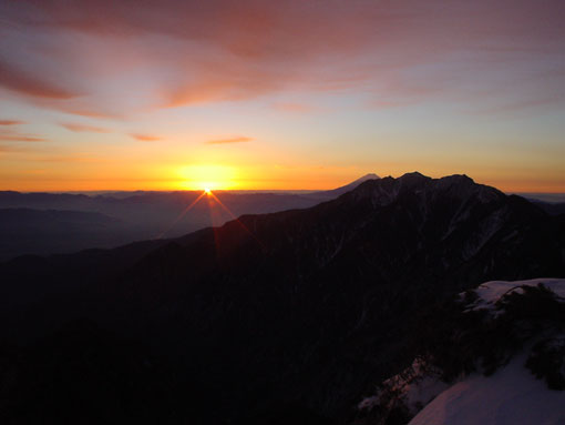 29日 4:20起床。もう少しシュラフにもぐっていたかったが、隣のテントも起き出した気配だったので、私も起きることにした。朝食はコーンスープとクラッカー。トイレは第二小屋横の外トイレまで片道4分の道のりをピッケルを持って往復した。5:50出発。お隣さんがわずかに先行した。ヘッドライトを点けて歩いた。6:30頃には大分明るくなってきた。雪は深くなくずっとトレースがあった。灌木のまばらな斜面を登り切ると8合目御来迎場になる。6:50日の出が拝めた。