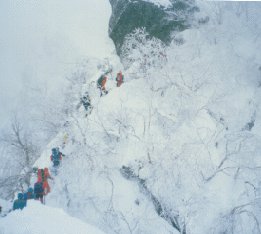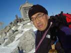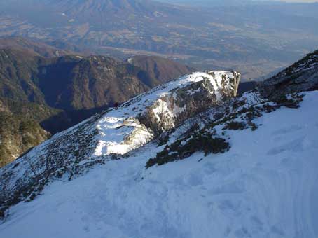 鞍部の手前から9合目方面の岩場を撮った写真。右の写真は91年12月のもので積雪量がかなり違う。91年の時は黄色の矢印のように稜線をたどったが、今回は夏道どおり緑の矢印のように左へ巻いた。9合目付近には鎖場が数カ所あり、凍結しているところは少し緊張する。岩の上に鉄製の刀がたっているあたりが9合目だと思うが、その先は斜面を登っていくと、じきに頂上に到着する。