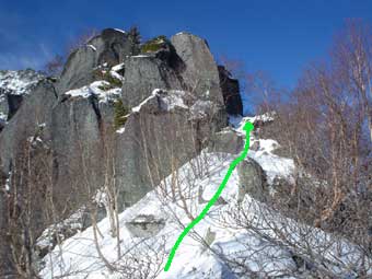 91年は黄色の矢印で示したところにルートを取っていたが、積雪が少ない時は緑の矢印のように左へ回り込んだ方が楽。