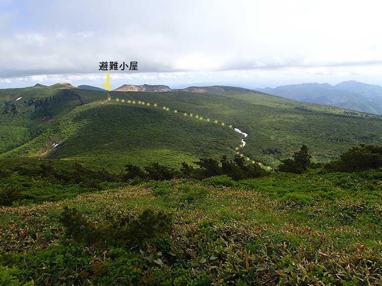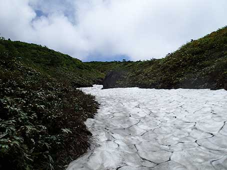 | 箕輪山から仏沢上部を見渡す。あの雪渓から、避難小屋まで近く見えるが40分くらいかかっている。 |