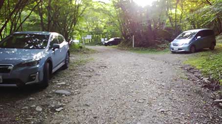 ダム湖畔の舗装道路が行き止まりになったところから、未舗装の林道へ入る。