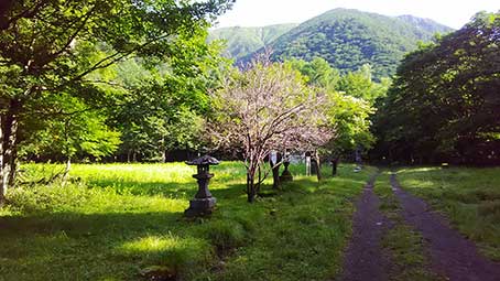 (あとで写真を確認するとゲートの看板には林道終点1,710メートルと書いてあったが、何の意味だろうか。 その時は710メートルと目に入った。 私の高度計を見たら730メートルを指していたので大体合っているなと思ってしまった。) (あとで考えると、林道の入り口からゲート(終点)までが1710メートルなのか ここから本当の林道の終点までの道のりが1710メートルという事かどちらかだろう。) 地図上ではゲートは840メートルくらいである。標高を260メートル稼ぎながら林道を45分ほど歩き 標高1100メートルの三斗小屋宿跡につく。 三斗小屋宿跡の手前に墓地がある。戊辰戦争で亡くなった兵士が葬られているらしい。 三斗小屋宿跡は石灯籠しかない草原だが、歴史の重みを感じる場所だ。 |