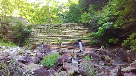 大きな堰堤。実体はコンクリート製だが前後が丸太で覆われ木目調になっている。 左側に固定ロープが垂れているので、それにしがみついて登る。 |
