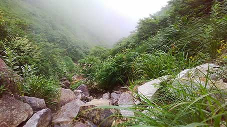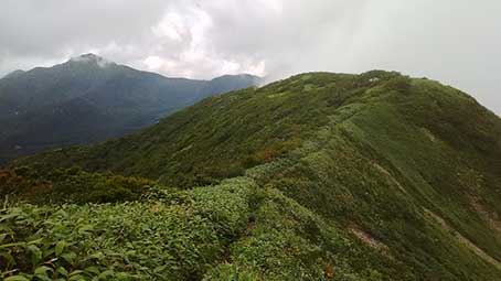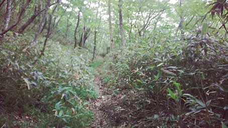 詰めの登りから、下を見下ろす 雲が出てきた。 沢筋に水がなくなり、両側から笹が伸びてきている所を、笹を捕まえながら登って行った。 最後は腰程度の笹を軽くかき分けて進むと登山道に出た。 |