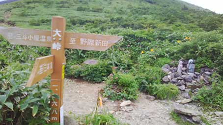 大峠の標識。地蔵がある ここまで天気が保って幸運だった。 ここから三斗小屋温泉への道をたどる |