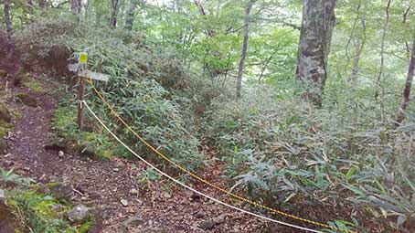 峠沢を横切ってから、会津中街道の分岐の看板に出会う。 中街道へはみだりに入らないようにロープが張ってあった。 |