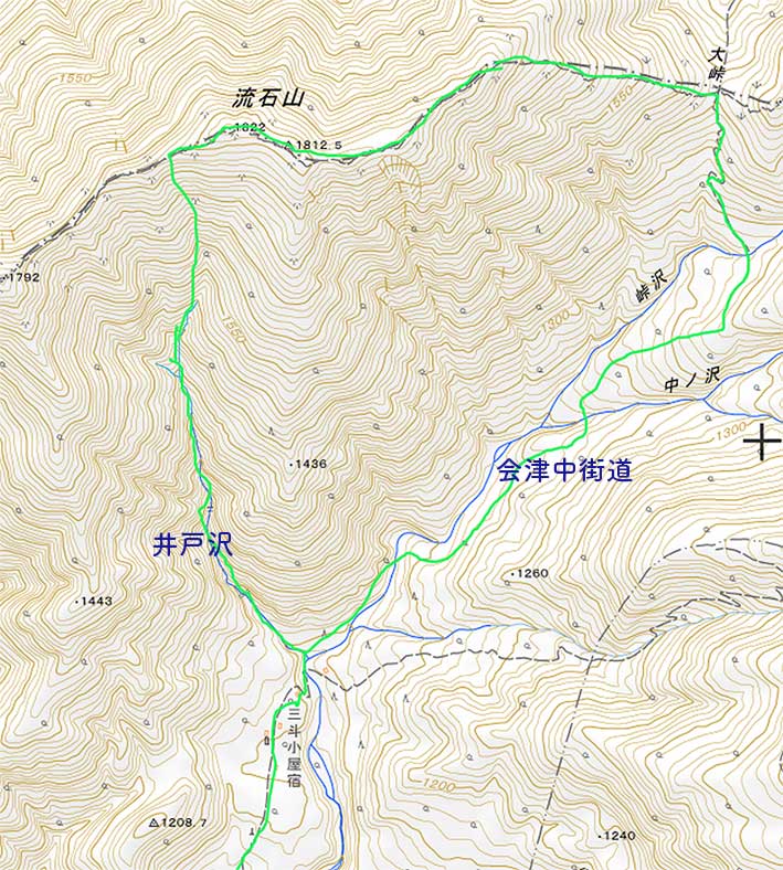 会津中街道。 会津中街道は那須から会津へ大峠を越えて通れるように、江戸時代に整備された街道だ。 笹の下刈りなどはなされていないが、昔は大勢の人が通ったらしい。 戊辰戦争のときは、大砲も通したというから驚きだ。 峠沢と中ノ沢の間の小高い所を通り、峠沢と中沢の出合の手前で中ノ沢を横切り、 合流した沢(湯川《苦土川》)の左岸をしばらく進む しばらく行くと、湯川を渡渉し、右岸に移る。 流れが速くて、渡りにくい。 こういうところが一般向けではなく、ロープでとうせんぼしていたのだろう。 中街道は井戸沢の出合付近に出た。その先は探したが不明だった。 |