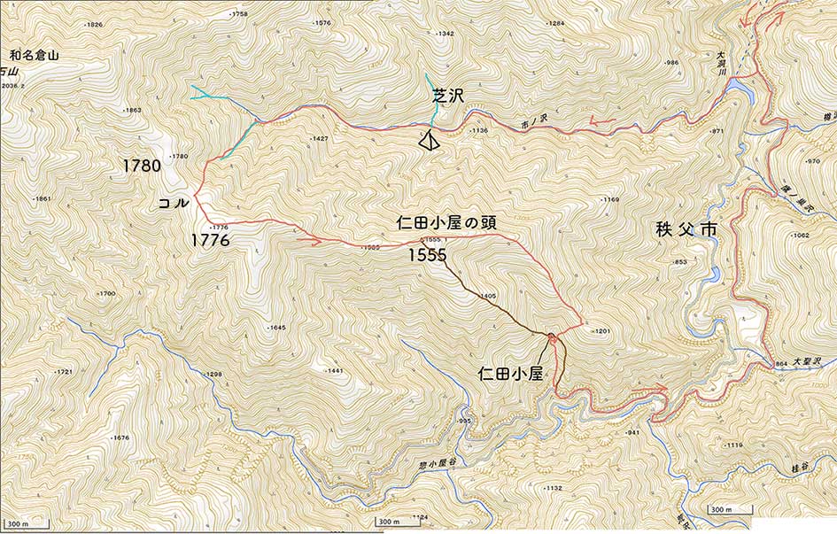 | 1780メートルと1776メートルの三角点のあいだのコルは広くて迷いやすい。赤テープはまばらについていた。 ここで靴を替えようとしている時に、一人の登山者にあった。 私よりも高齢な感じで、将監小屋から縦走してきたそうで、仁田小屋尾根を降りて行った。 |