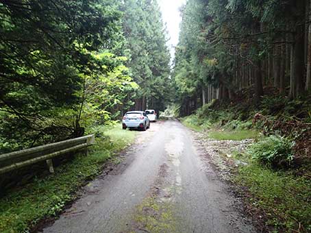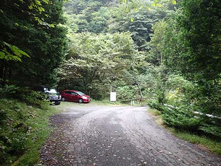 | 大洞林道の鮫沢橋のところがゲートになっている。ゲート前には2台の車が斜めに止まっていたため、それ以上とめられず、少し手前の路肩に止めた。 | |