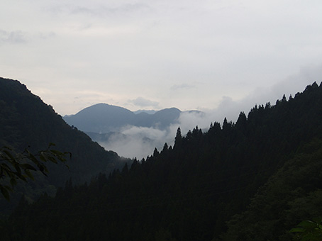 | 朝の光が届かない谷から遠方の山を見た。 車止めから10分ほどで林道から取水施設へのモノレールがつながっているところに出る。 モノレールのレールをくぐって斜面を下降する道へすすむ。 |