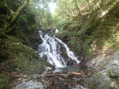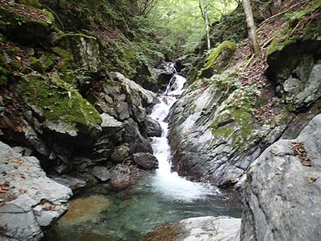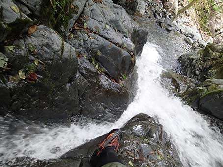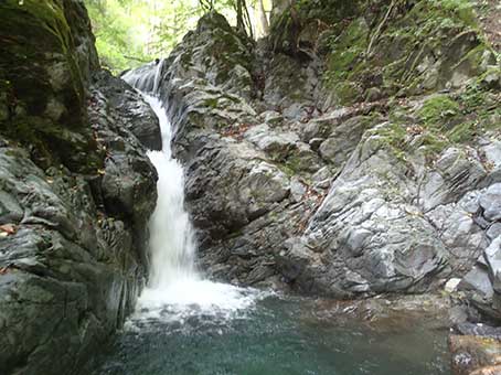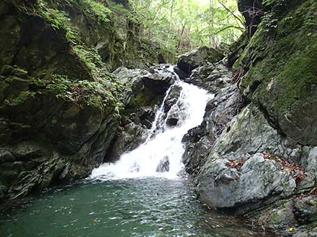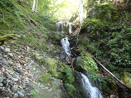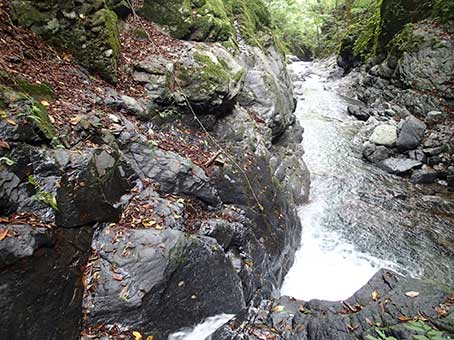 | こんな小滝も釜が深くて取り付けず、右の斜面を登って高巻いた。振り向いて撮った写真。 | |