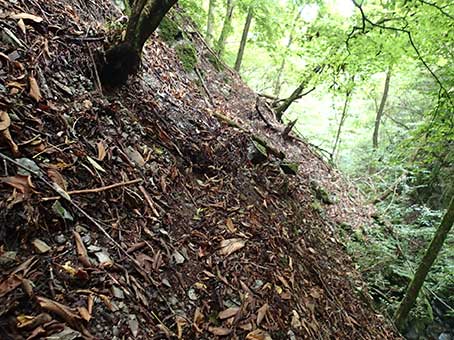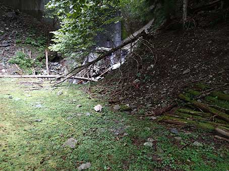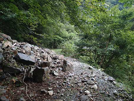 | 立派な取水施設。対岸へ渡るとトラバース道がある。 ロープが張ってあるところがあるが、ロープも切れているので、トラバースに不安を感じたら、早めに沢へ降りてしまったほうがよいだろう。 私は、危なっかしいトラバース道を進み、堰堤の先へ降りた。 |