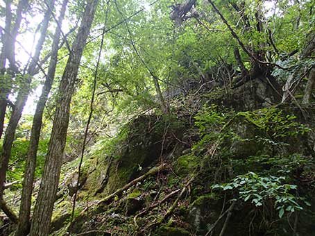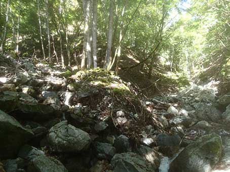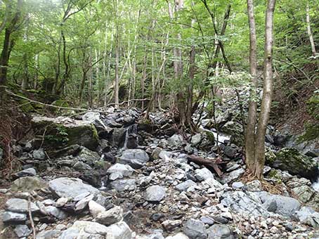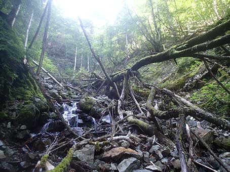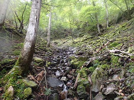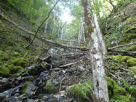 | 源流部まで沢を詰めていく。GPSで確認しながら最後は左寄りにすすんだ。 | |