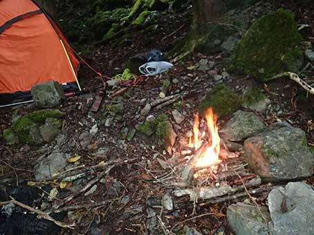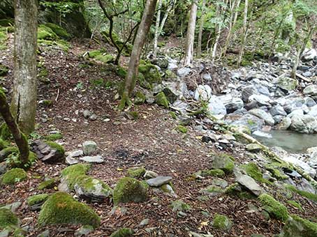 天気は曇りだった。 芝沢出合いに13:15頃到着した。 幕営適地があった。テントが3つくらい張れそうだ。 時間が早かったのでもうすこし上流に幕営適地がないかどうか、 1時間くらい遡行してみたが適当なところはなかった。45分で戻った。 やはりここだろう。 くつろいだり、暖をとるために焚火をした。 夕食はペヤングソース焼きそばでコンロで作った。 コンビーフをかじりウィスキーを飲んだ。 夜はなぜかあまり深く眠れなかった。 |