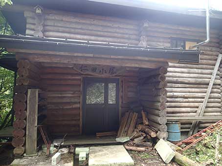 | 仁田小屋に降りるところには看板くらいあるかと思って歩いていたが、ずっとなかった。 あらかじめ、ネット上で調べたところでは、仁田小屋の頭から1201メートルピークのある尾根をくだり途中で小屋へ向かって降りていくのを想像していたが 後で調べなおすと仁田小屋の頭から1405メートルの三角点がある尾根を下っていくルートがあるようだ。 私の通ったのは赤線のルートで、1201メートルの手前のコルから、右方向へ林業の手の入った杉の葉の堆積する斜面を強引におり、沢に出た。 このまま沢を降りればよいか、と思っている時に上をみると小屋が見えた(上左の写真) 仁田小屋と思われ、そこへ上り返せば、ルートがはっきりすると思い、割れた一升瓶が散乱する斜面を登って行った。 小屋はしまっていた。登山者が使うためのものではないのかもしれない。玄関で雨宿りをするくらいの使い方はできそうだ。 上から小屋までは道があったが、その先は分からなくなっていた。 あとで調べると、沢を渡ってから斜面をおりる道がつけられていたようだ。(地図上こげ茶色の線) 小屋から見て、右側の尾根の続きに道があるか、と思い、懸垂下降を繰り返してみたが、道はわからなかったので、沢靴に履き替えて、沢を降りて行った。 しばらく降りると、堰堤がみえ、左側から堰堤を超えると、道があり、林道に出られた。 |