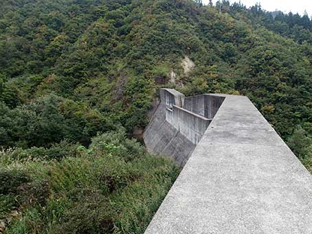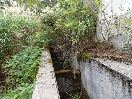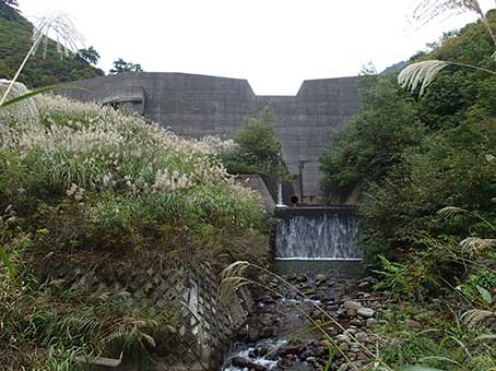 | ススキなどの丈の高い草の藪をかき分けて進むと、大きな堰堤が出現する。 堰提を魚が越えられるようにしている魚道がある。藪の中なのでうっかりするとこれに落ちて怪我をする。 コンクリートの魚道に気をつけながら、これを利用し堰堤に登る。 |