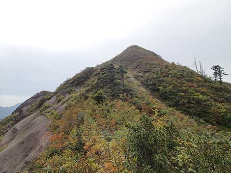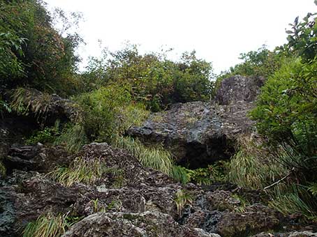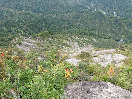 | 12時15分頃スラブの頭に上がった。前方に裸山の頂上が見えるがそこまでは藪だ。 スラブをもう一度見下ろした。 |