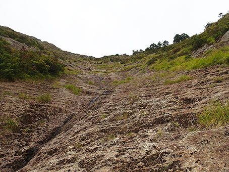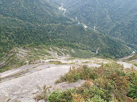 | ゴム底の沢靴はスラブとの相性がよく序盤から中盤までは気楽にどこでも登れる感じだ。 上部は傾斜が強くなってきて、比較的傾斜がゆるそうなところを選びながら登って行くが、結構気を使った。 下を見下ろすと怖い。 |