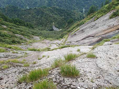 | 標高差100mほど登ると二俣になり、右俣へ進む。 左俣を進んでも結局同じところへ出られるようだ。 少し登ると視界が開け、前方にスラブの全貌が現れた。 想像していたよりも小規模で威圧感はなかった。 |
