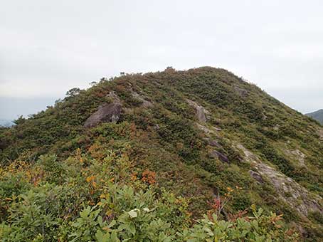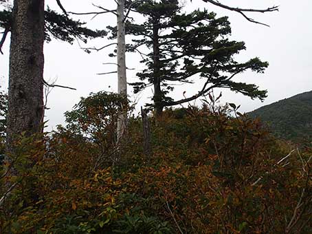 | 藪漕ぎをして裸山頂上についた。12:35 三角点を探したが見つからなかった。 頂上でもdocomoの携帯電話は圏外だった。 北東の稜線を藪漕ぎで降りて行く。 |