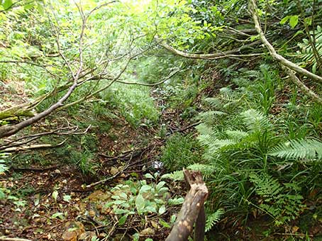 | 降り始めることにした地点の前方の景色。 初めは藪漕ぎしながら降りて行ったが、沢の源流が現れた。 |
