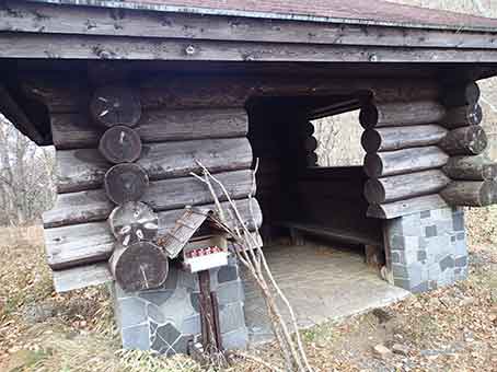 | 登山口にログハウスの東屋がある | 下山時は駐車場はガラガラになっていた。 |