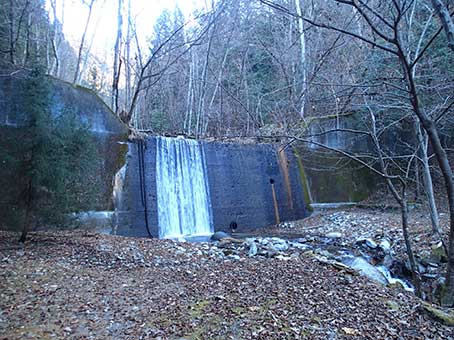 はじめのうちは車も通れる林道だ。 堰堤もいくつか出てくる。 この堰堤は前を横切って行ける。 |