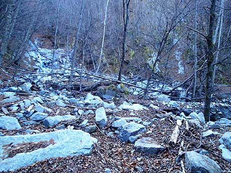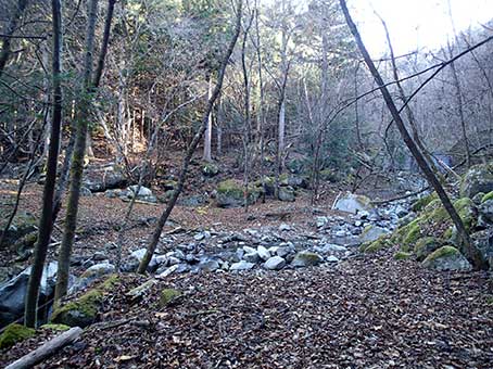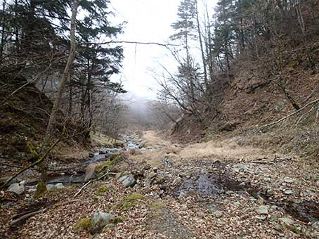 | 林道終点で登山道入り口。10:30 | ナメ滝を高巻く杣道のような登山道 |