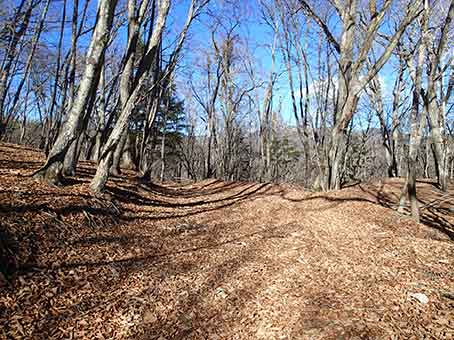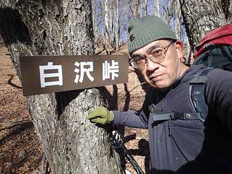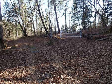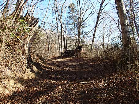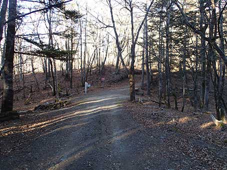 | 峠の標識で記念撮影 | ここからは枯葉に埋もれた林道歩きが始まる。 |