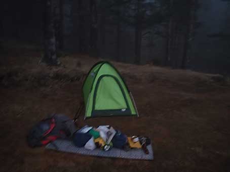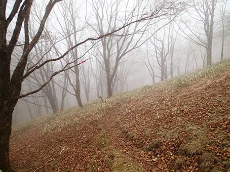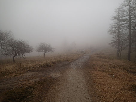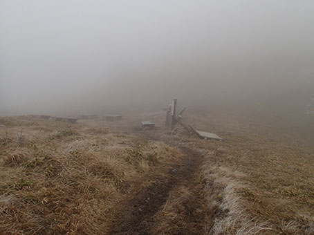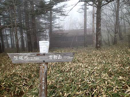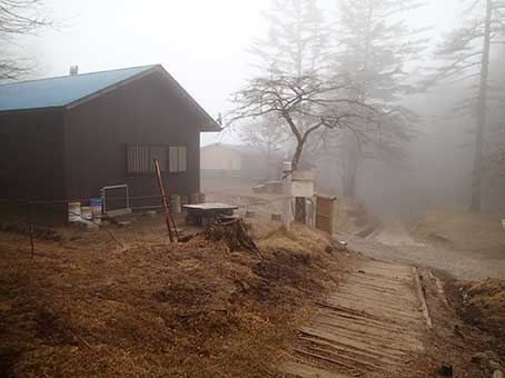 | 朝靄の中の小屋 | 笠取山方面への道 | テントを畳み、6:50頃出発した。