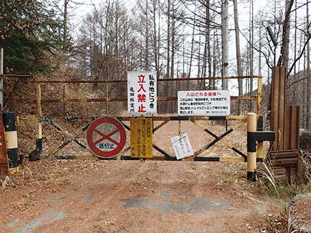 | 林道が出て来た | 林道のゲート。林業会社の私有地らしい |