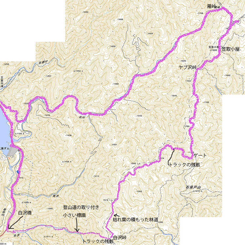 広瀬ダムから白沢橋は2kmくらい、 白沢橋から白沢峠の標高差が約600m 白沢峠からほぼ等高線に沿ってつけられている 林道歩きが約7kmだ 雁峠から広瀬までの距離が長いが、 傾斜の緩い下りの道が続いている。 |